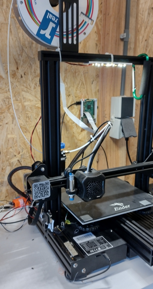 The power supply of the ender is 24V. It can handle a raspberry pi just fine. Also a led strip on the top bar will give it enough light for the camera.